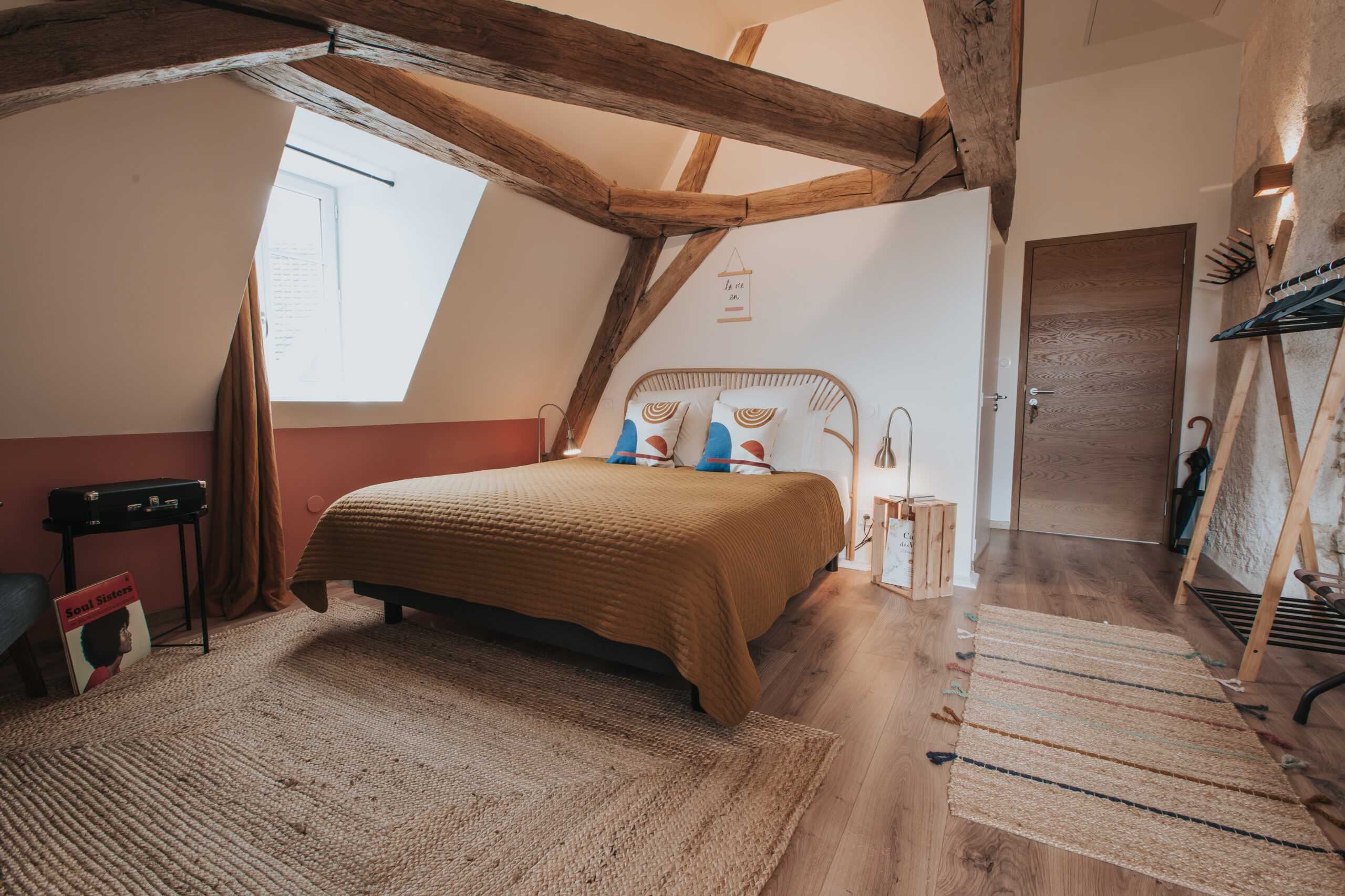 Avec sa charpente majestueuse et ses volumes atypiques, notre chambre Les Petits Noizons séduit par son côté cocooning et ses vues charmantes sur l’église, le pré des ânes ainsi que les vignes qui entourent le village.